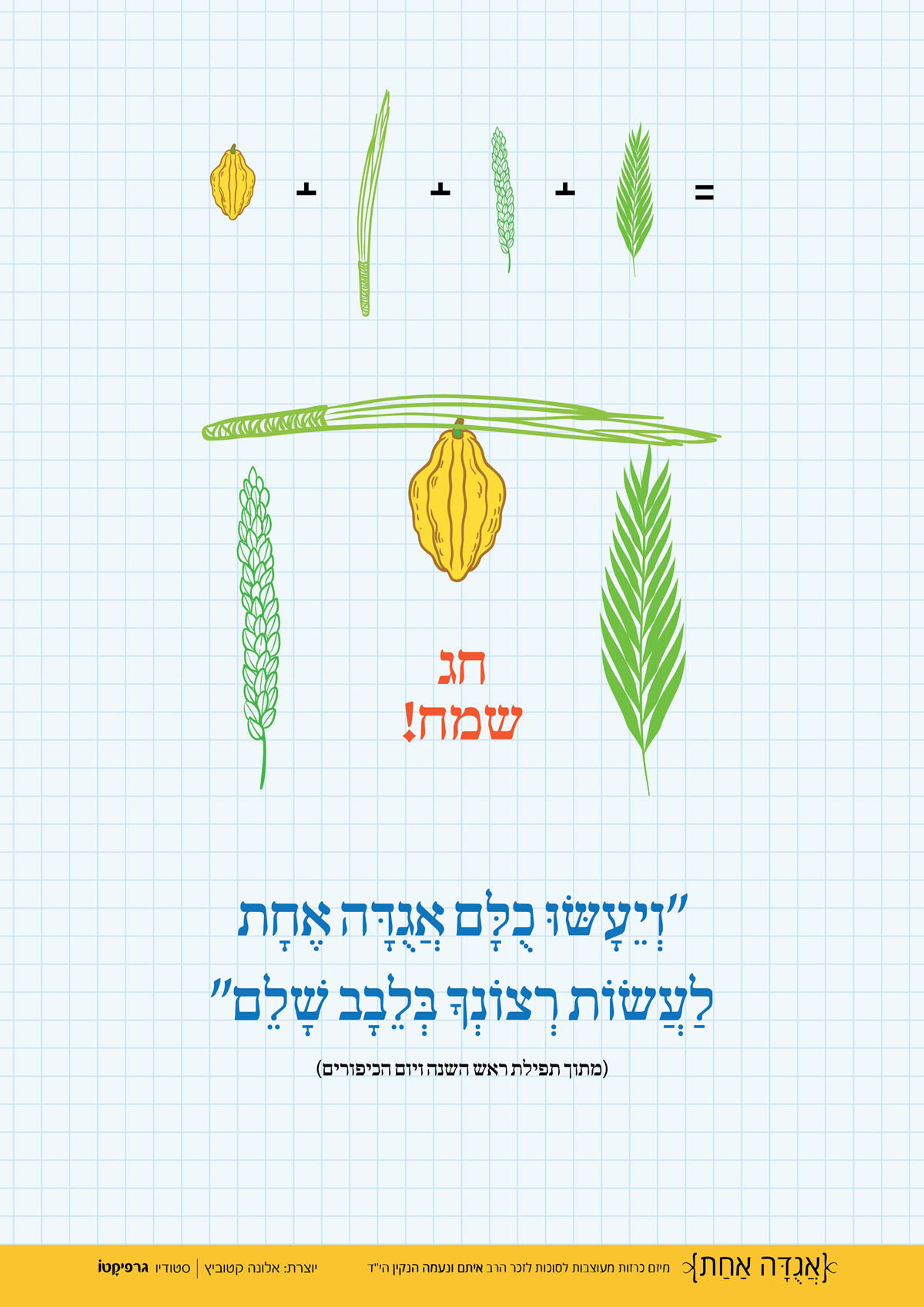 בכרזה שלפניכם בחרתי לשלב את ארבעת המינים יחד עם השראה מהמשוואות הויזואליות שנעמה היתה יוצרת כחלק מתהליך עיצוב לוגואים ללקוחות שלה.