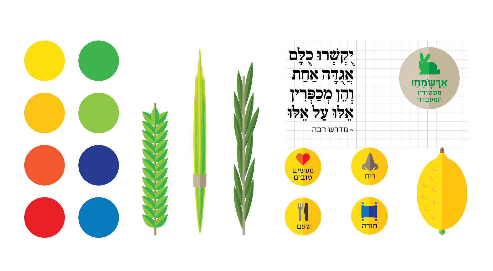 העבודה האחרונה שנעמה עיצבה היתה כרזה לסוכות. כזו שכל אחד יכול להוריד למחשב, להדפיס ולתלות. מה שנקרא פרינטבל (ניתן להדפסה). הכותרת של הכרזה הזו היתה “אגודה אחת” וארבעת המינים שבה הם ייצוג של אומה אחת. מאוחדת. וארנב שמח אחד (דש מהארנב של סטודיו המעבדה) שגם היום עושה לי לחייך וכל כך מתאים לאופי העבודות של הסטודיו שלה.