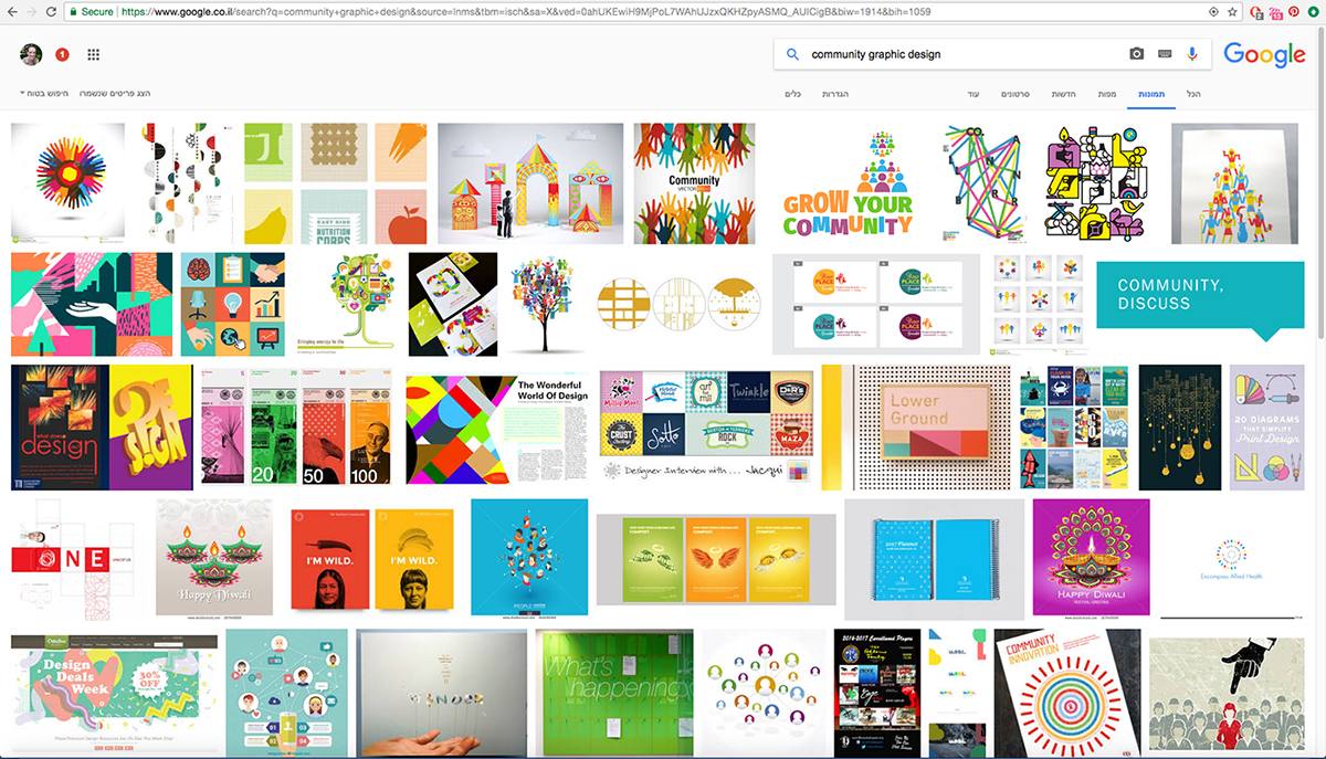 צירופים מומלץ לצרף מעולם העיצוב ולהתאים לתוכן הויזואלי הנכון לפרוייקט, למשל אם ניקח את המילה קהילה לדוגמה, והפרוייקט הוא עיצוב לוגו, אנחנו נחפש: